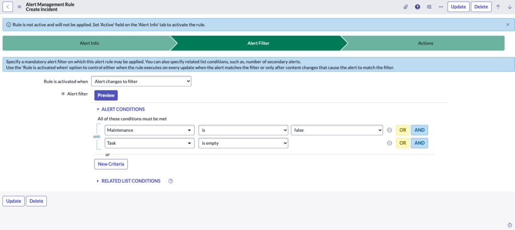 Alert rules are triggered according to the conditions defined in this tab. ServiceNow Event Management offers a wide range of conditions that can be used.