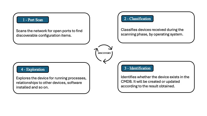 Discovery is carried out through the MID servers, which execute a series of commands (Probes) received from the ServiceNow platform to the local network, and return the result of these commands to the instance in XML format (input records in the ECC Queue table). The XML result is then processed by the Sensors, which update the CMDB according to the existence or non-existence of the collected devices. The discovery process is divided into four phases: