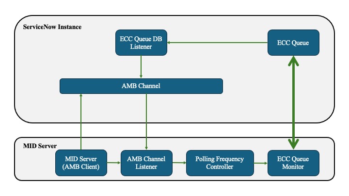 Communication between the MID server and the instance takes place via the ECC Queue table. The ServiceNow instance inserts records (jobs) destined for the MID server into the ECC Queue table (outpout record), and the MID continuously polls this table to identify unprocessed records, an operation known as Polling. By default, polling is performed every 40 seconds. The frequency can be modified by the mid.poll.time parameter.