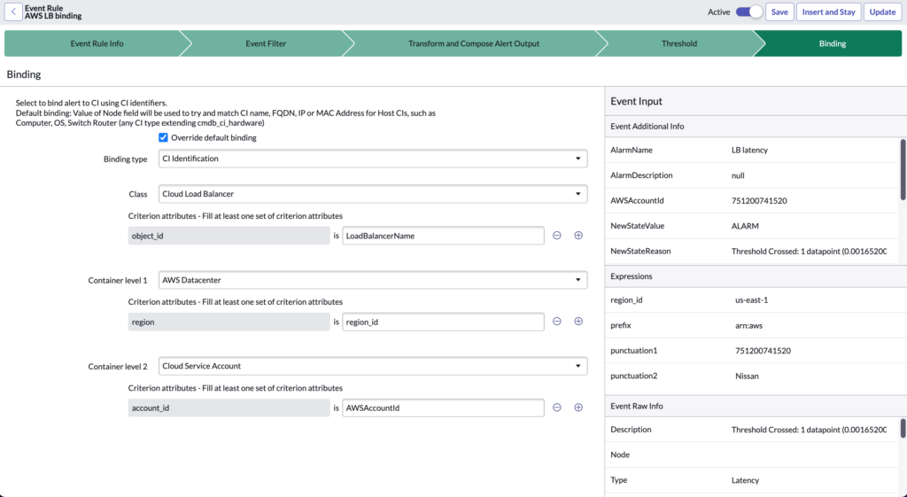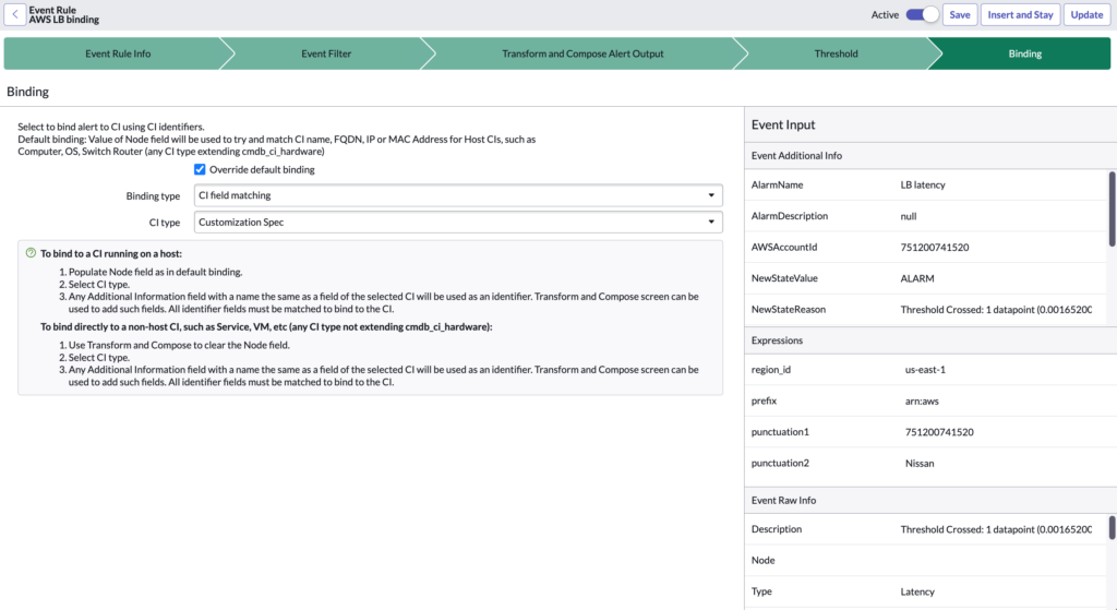 By default, events are bind to CIs based on the Node value, which is either a host name, IP address, MAC address or FQDN. To better bind alerts to the CIs concerned, the Event Rule uses this section to better identify the CI concerned in the CMDB. Two types of Binding are available: