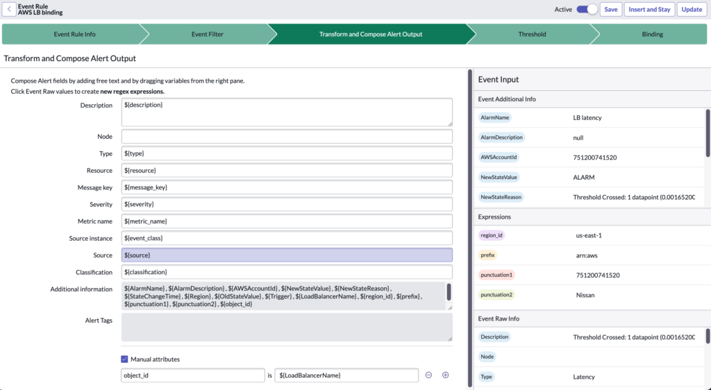 - Transform and Compose alert information from relevant data in event fields.