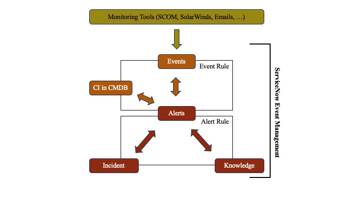 Before going deeper, it is important to note that the Event Management application does not replace the monitoring tools in place within the organization, and is therefore not a monitoring tool. Its mission is to :